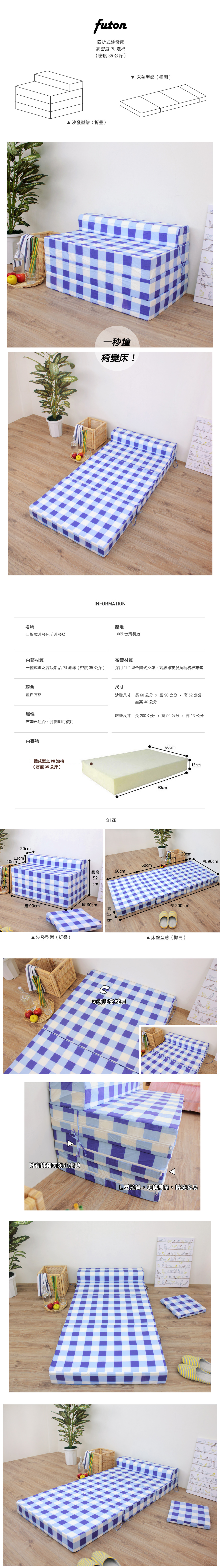 ◆商品名稱:【藍白方格】坐高40床長200公分-四折式沙發床/沙發椅