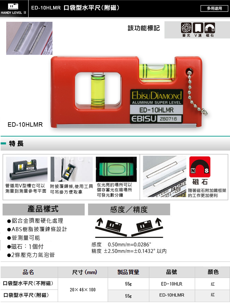 Ebisu DiAMOND 口袋型水平尺 V形槽 帶鏈條 磷光 磁鐵 鋼架施工 1個