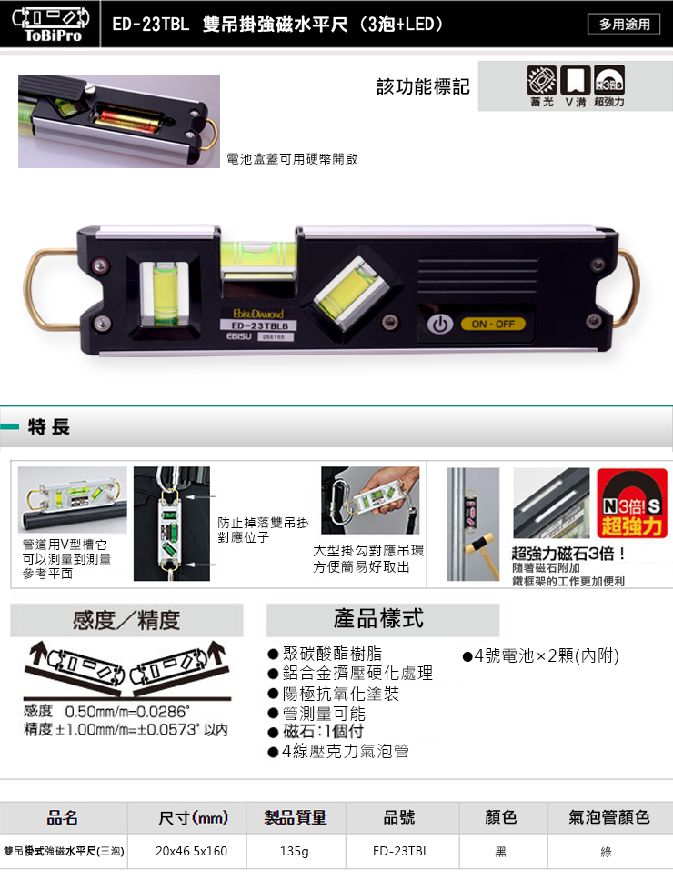 【日本EBISU】雙掛勾強磁性LED水平尺-3泡式
