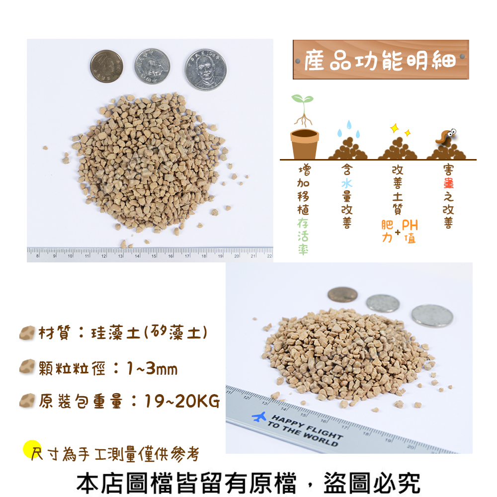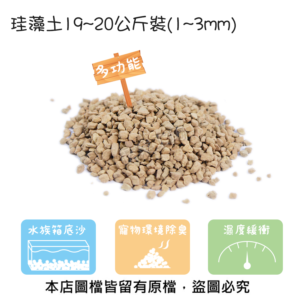 珪藻石(矽藻土顆粒):本產品由矽藻土以上千度之高溫燒製而成,具有原礦之結構、孔隙度高、吸附性強、質輕(每兩公升約等於一公斤出頭)、堅固、隔音、耐熱、耐磨、耐酸鹼及傳熱性低等特性....其在園藝方面之運用範圍甚為廣泛,為優質的園藝栽培介質及土壤改良資材,例如做為蘭花或室內盆栽或種子種植之介質、增加樹木移植或新植之成活率、旱地土質含水量之改善、土質肥力及PH值之改善、土壤線蟲或害蟲之改善、亦可作為水族箱底沙、飼養寵物之環境除臭、濕度及溫度緩衝、環境或櫥櫃內濕度緩衝、或作為過濾器之濾材...以上皆有相當不錯之效果。