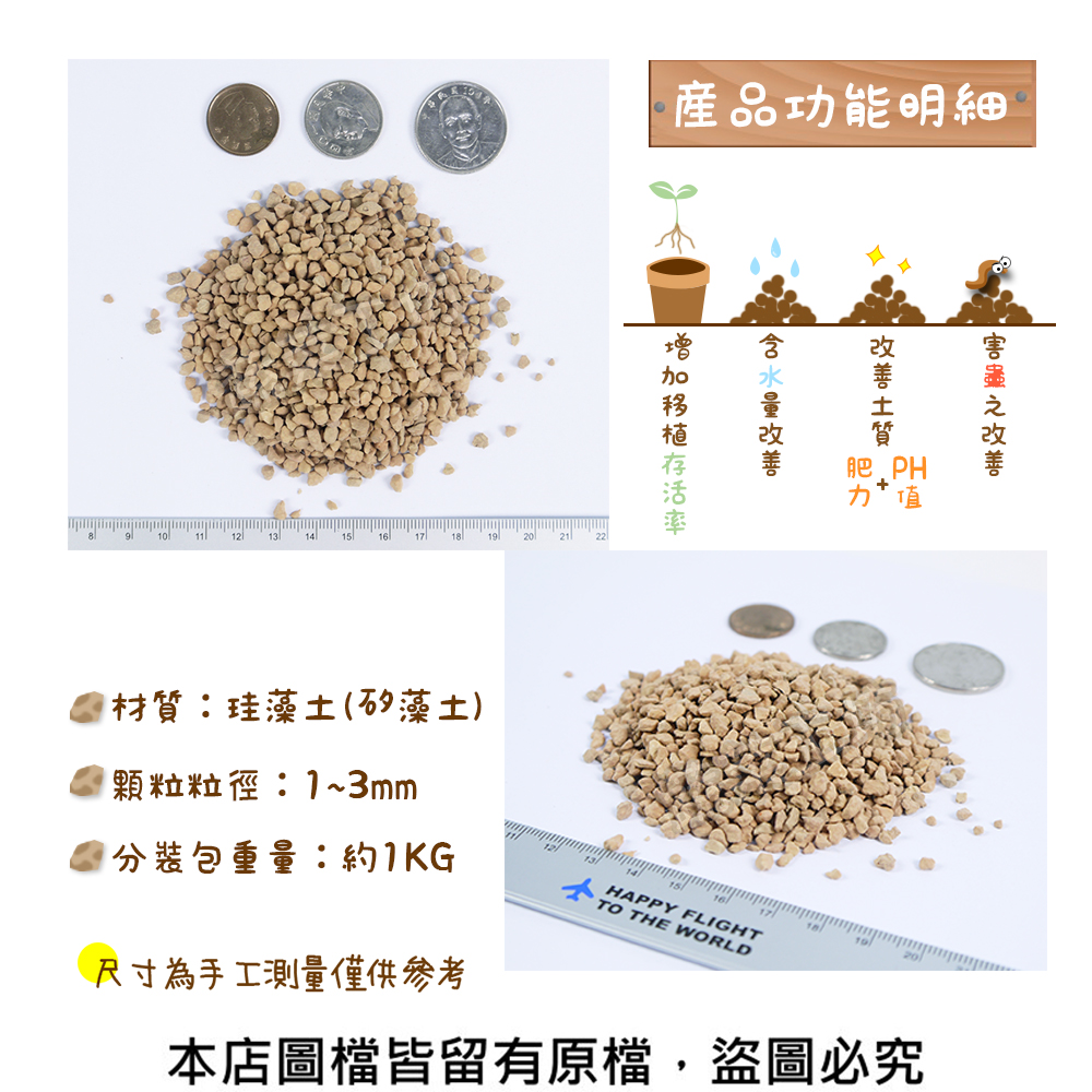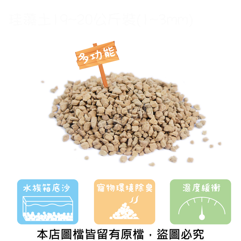 珪藻石(矽藻土顆粒):本產品由矽藻土以上千度之高溫燒製而成,具有原礦之結構、孔隙度高、吸附性強、質輕(每兩公升約等於一公斤出頭)、堅固、隔音、耐熱、耐磨、耐酸鹼及傳熱性低等特性....其在園藝方面之運用範圍甚為廣泛,為優質的園藝栽培介質及土壤改良資材,例如做為蘭花或室內盆栽或種子種植之介質、增加樹木移植或新植之成活率、旱地土質含水量之改善、土質肥力及PH值之改善、土壤線蟲或害蟲之改善、亦可作為水族箱底沙、飼養寵物之環境除臭、濕度及溫度緩衝、環境或櫥櫃內濕度緩衝、或作為過濾器之濾材...以上皆有相當不錯之效果。