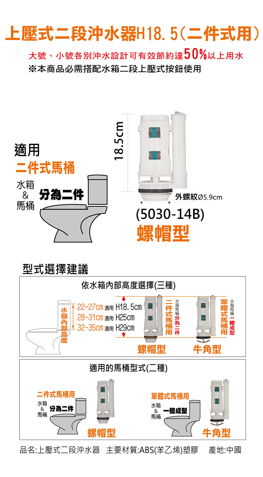 上壓二段沖水器H18.5 二件式馬桶用