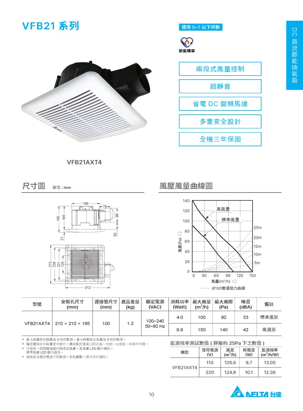 台達電子 21型二段大風量型 直流換氣扇 VFB21AXT4