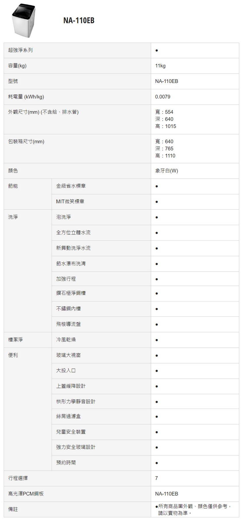 Panasonic國際牌 11公斤定頻洗衣機 NA-110EB-W~含基本安裝+舊機回收