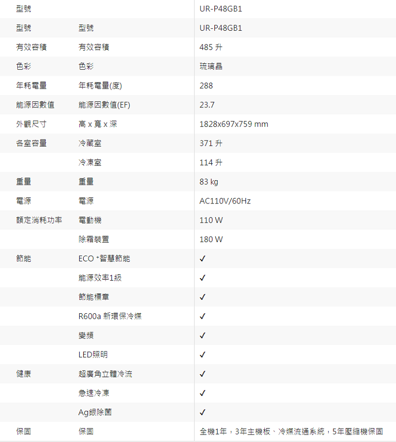 奇美 CHIMEI 485公升 UR-P48GB1 -琉璃晶 變頻雙門冰箱