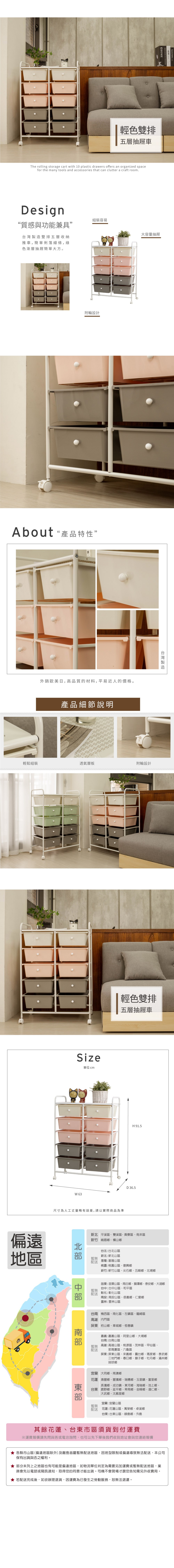 【ikloo】輕色系雙排五層收納抽屜車(雙色可選)粉白灰