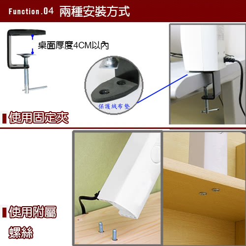 第二代《優學習》日系LED無藍光學習桌燈,主體有 三個關節,具有多種角度調節功能,讓燈罩 上下左右可以各約90度旋轉與調整仰角,因此光源照射方向就可以上下、前後、左右調整,十分的實用與便利。