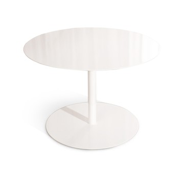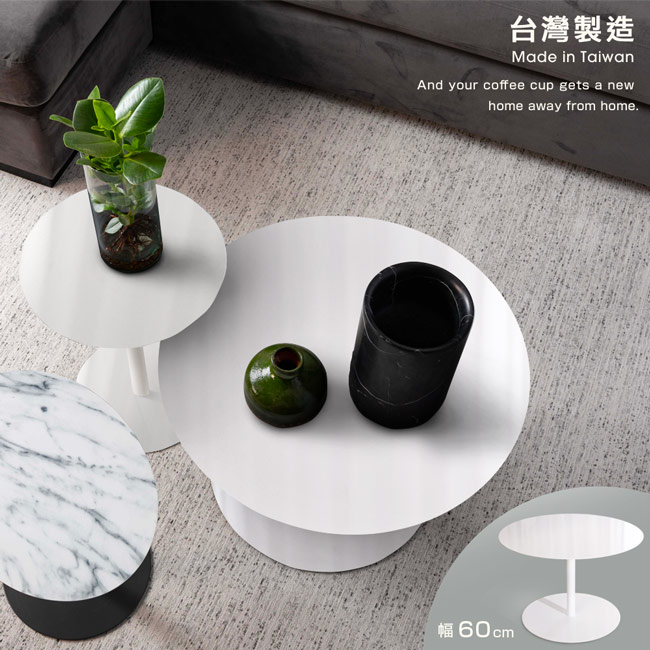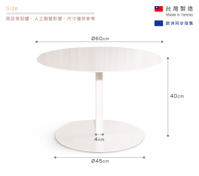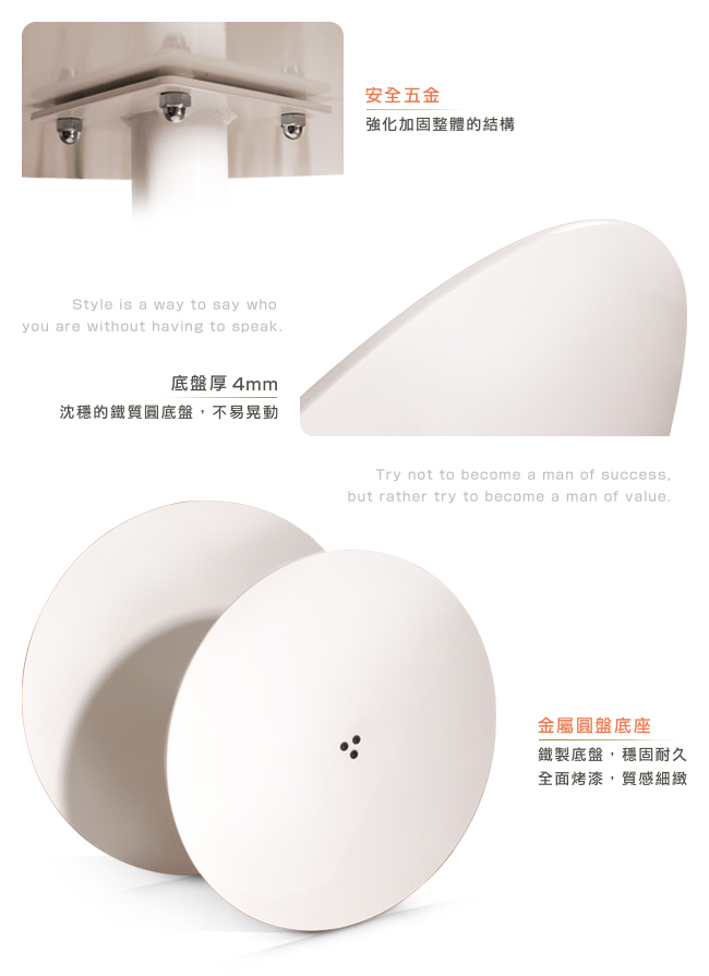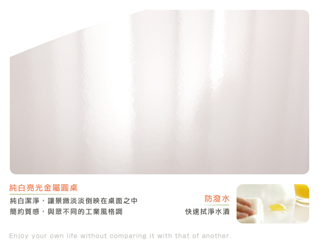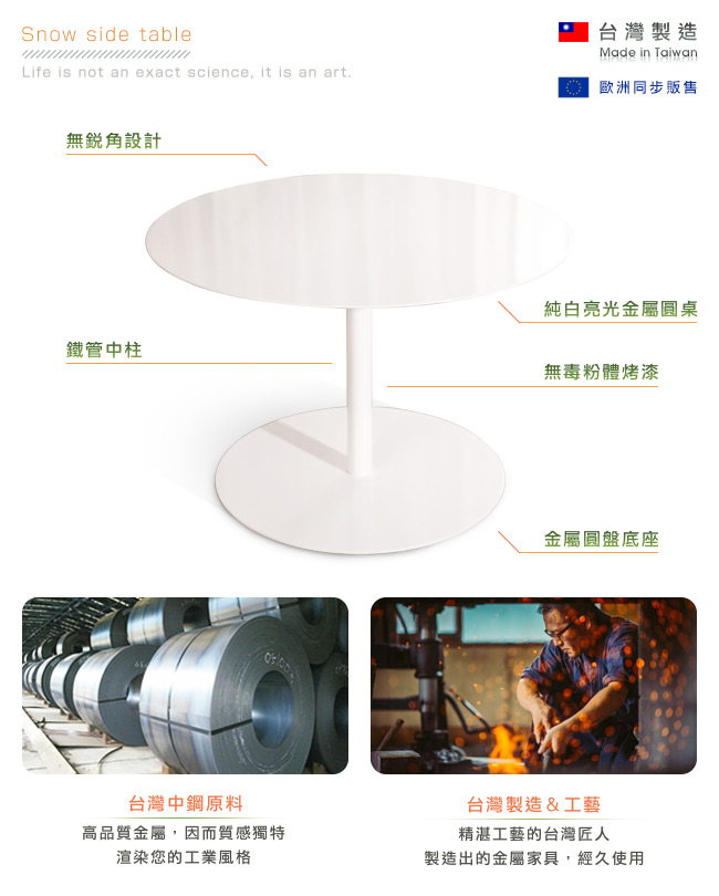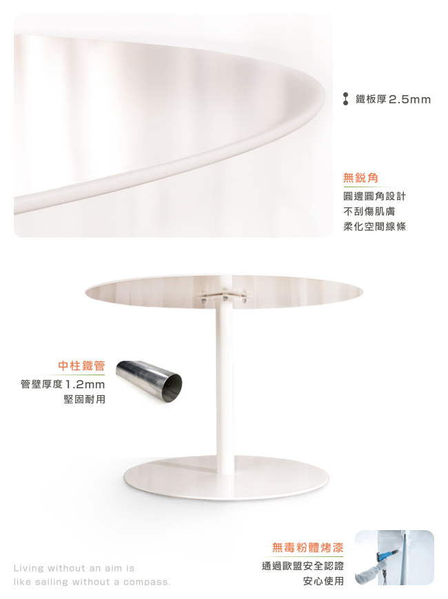 台灣製造,品質安心,值得信賴,歐洲同步發售中。使用台灣中鋼高品質金屬原料,因而質感獨特,渲染您的工業風格。純白亮光金屬圓桌,鐵板厚2.5mm,讓景緻淡淡倒映在桌面之中,增添質感。防潑水,快速拭淨水漬。邊緣無銳角設計,不刮傷肌膚,柔化空間線條。中柱鐵管,管壁厚度1.2mm,堅固耐用。無毒粉體烤漆,通過歐盟安全認證,安心使用。桌下的安全五金,強化加固整體結構。金屬圓盤底座,底盤厚4mm,鐵製沈穩,穩固耐久。全面烤漆,質感細緻。