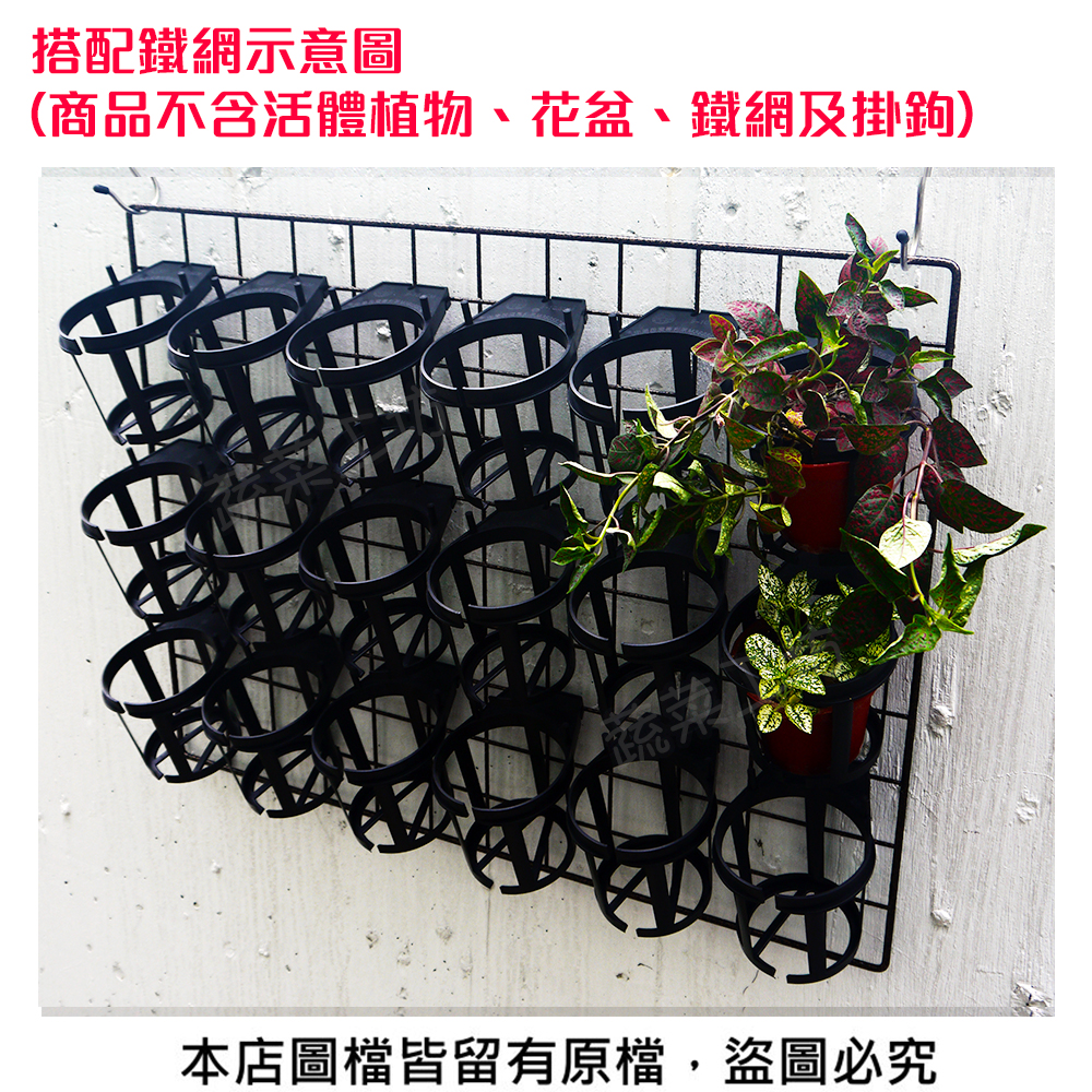 1.有設計掛鉤可懸掛寬度3mm的鐵網、欄杆、鐵線 ,安裝於鐵網,製作花牆、花柱、植生牆、生態牆,需注意鐵網及牆面本身的耐重。