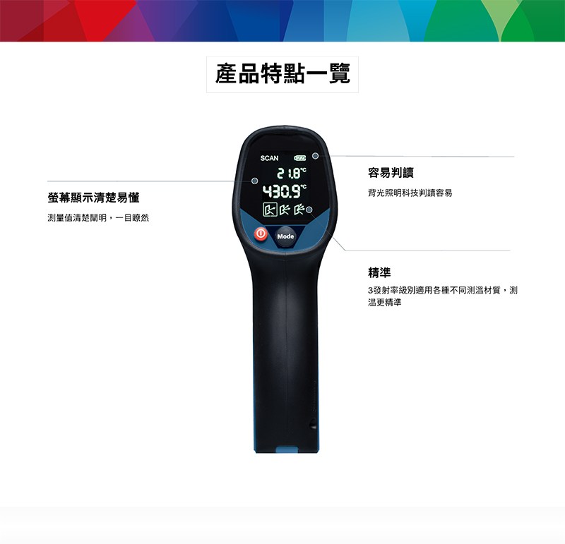 BENETECH 標智 紅外線彩色螢幕測溫槍 50-530度 快速測溫 精準可靠 1組 藍色 + 黑色