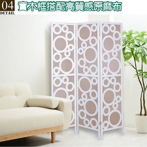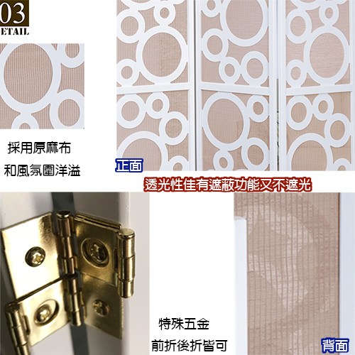 誰說屏風的樣式一定是古典與老派 ,新設計風格與跟傳統日式屏風不同的是 ,不再拘泥框框與方格,改以純白色木框和作工複雜的大大小小圓形搭配原色麻布彰顯品味與時尚,比起傳統的和紙或不織布更不易破, 透光性佳有遮蔽功能又不遮光 ,散發新日式水玉點點圖案的高尚風格。