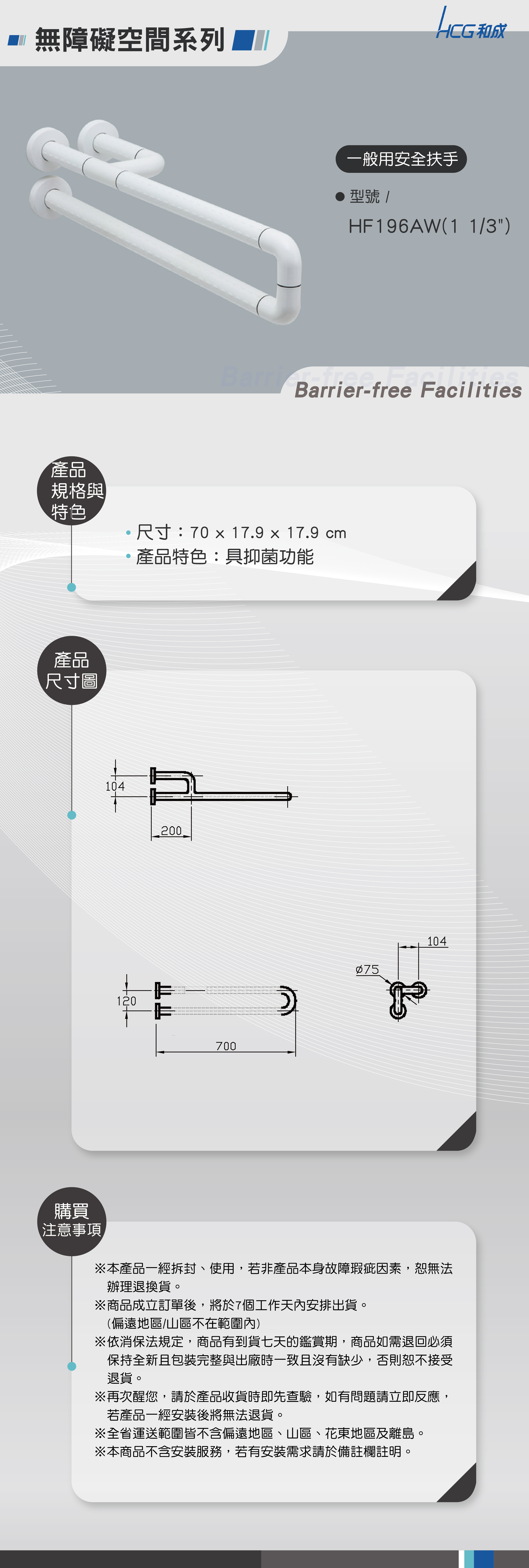 和成HCG 抑菌安全扶手 HF196AW 70cm