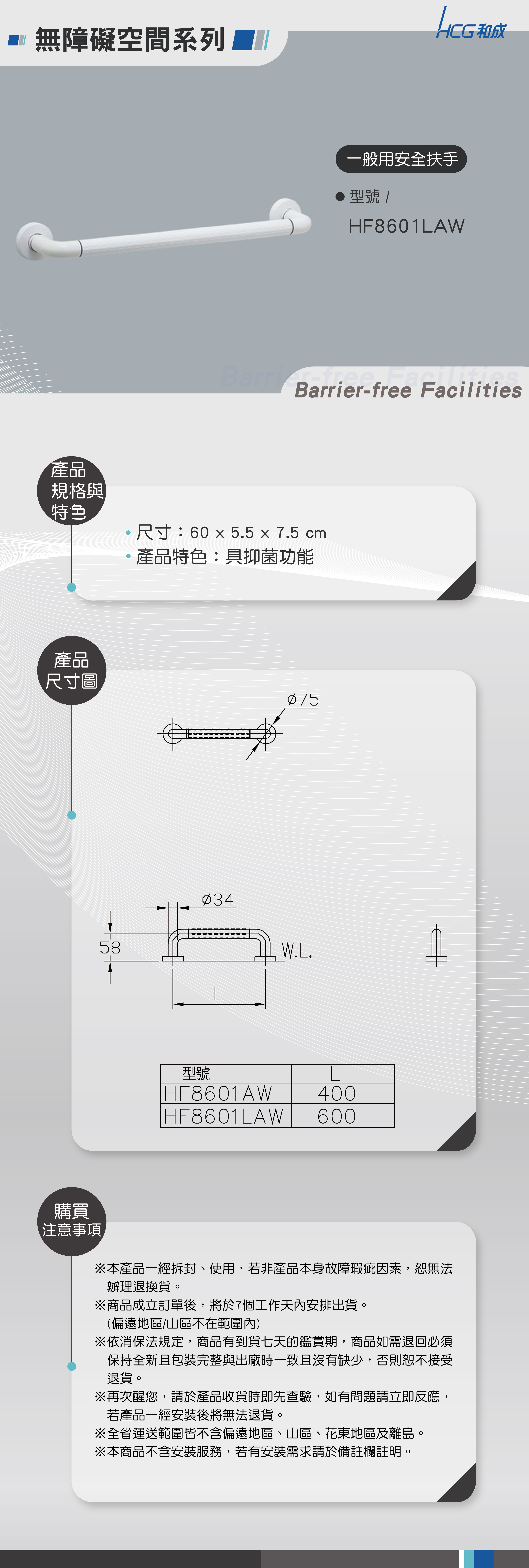 和成HCG 抑菌安全扶手 HF8601AW 40cm