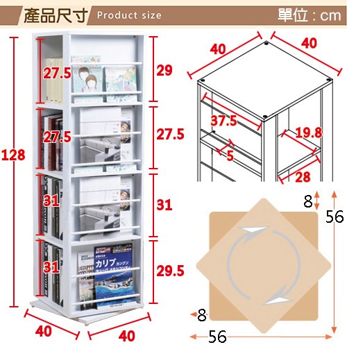最大的長度與寬度只有40cm,您可以將角落無法利用的空間,或者旋轉半徑46平方公分的小空間,變身為一個四層的超級書架收納櫃,讓您改造空間毫不費力,輕輕鬆鬆就能把大容量的收納櫃放置於小小的角落喔!它兩面共有八格,寬度28公分x深度x19.8公分x高度27.5或31公分的大收納空間,適合放置A4大小的書本或收納DVD。
