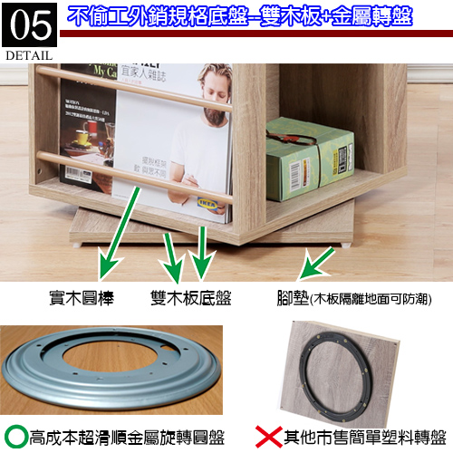 最特別的是在底盤使用了兩塊木板並在中間裝設高成本的金屬旋轉圓盤耐重力提高並且旋轉更加滑順,要注意的細節是一般市售類似品只用一塊底板並安裝簡單的塑料滾珠圓環,除了塑料耐重力不佳日久容易碎裂並因與地面距離過近,當底板稍有變形時會因旋轉時底板摩擦地面導致整體傾斜變形,購買時不可不慎選哦。