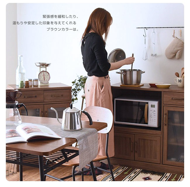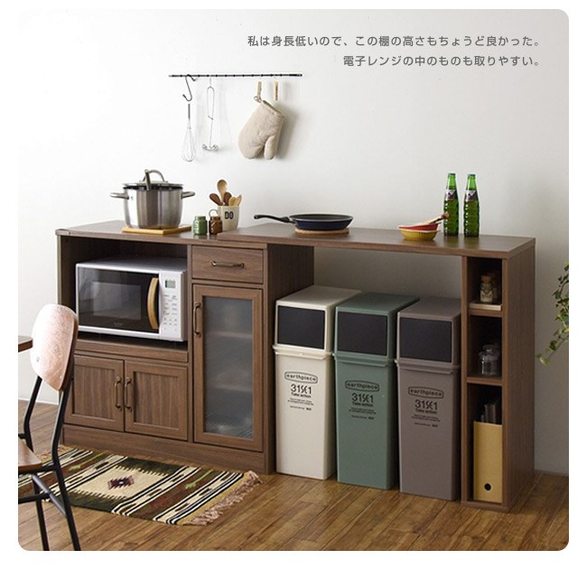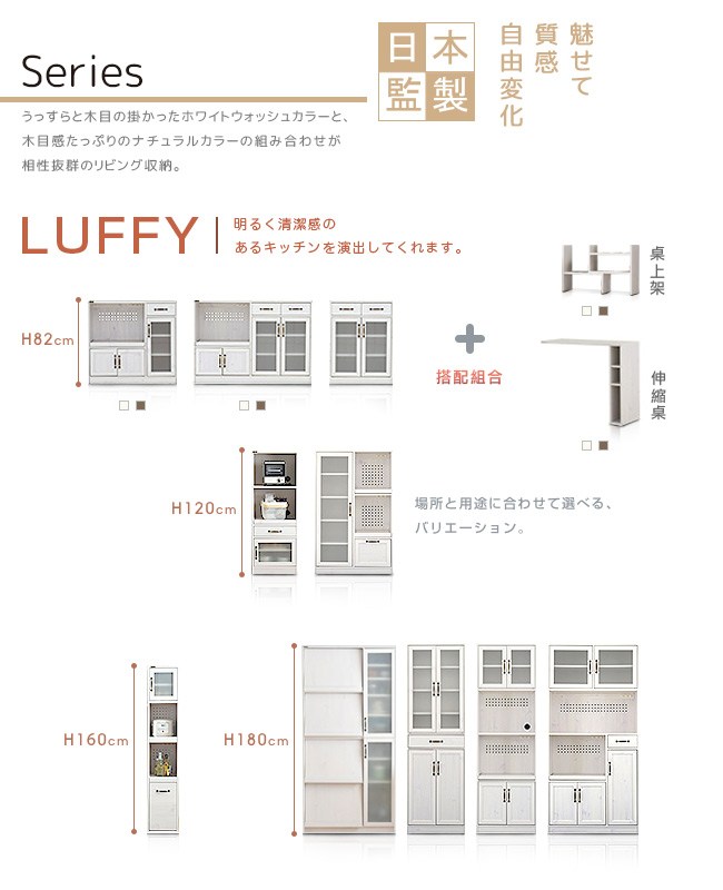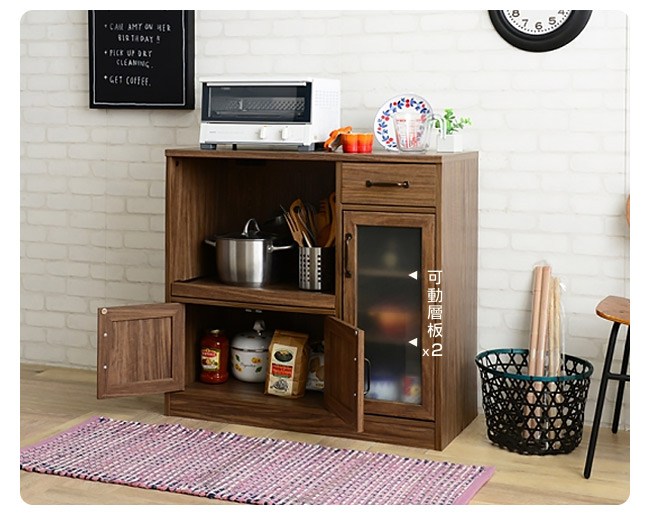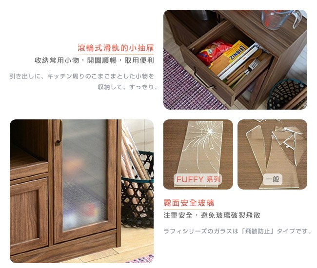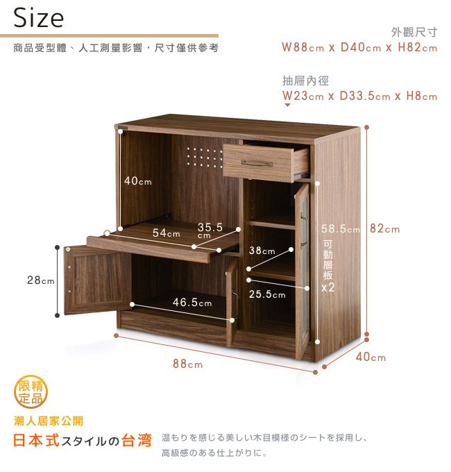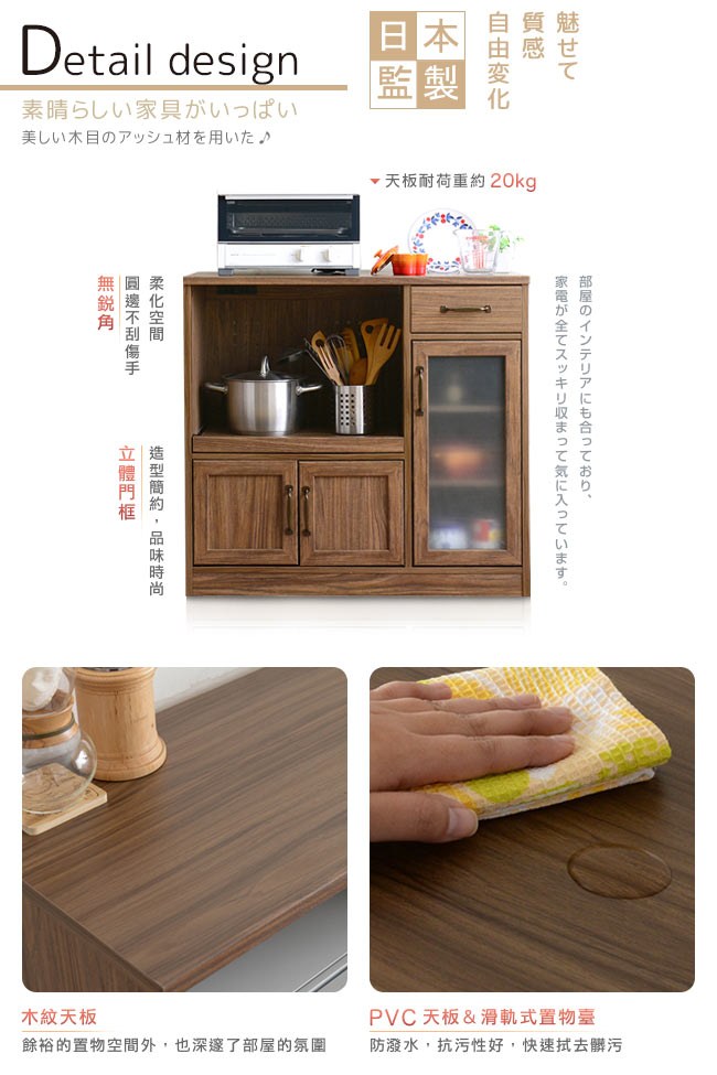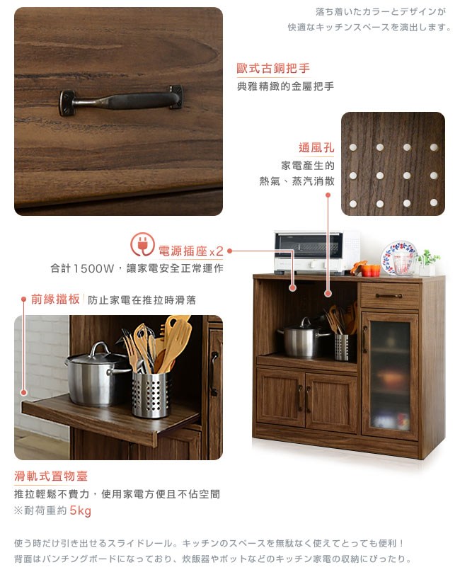 櫃高82cm,檯面可作為料理的工作臺,或放置微波爐、烤箱。從滾輪式滑軌的抽屜中,自然拿取小物,輕鬆不費力。滑軌式置物臺,PVC材質,耐荷重約5kg。推拉輕鬆,使用家電方便且不佔空間。並有前緣擋板,防止滑落。電源插座兩個,合計1500W,供電穩定,讓家電安全運作。背板附有通風孔,讓家電的熱氣和蒸氣消散。門板吸附磁鐵並有緩衝機制,開關輕巧靜謐。單門三層置物,與可動層板設計,耐荷重約5kg。您可以量身訂做空間大小,擺放杯碟碗盤。下方雙門收納空間,適合放鍋碗瓢盆,或較大些的物品。