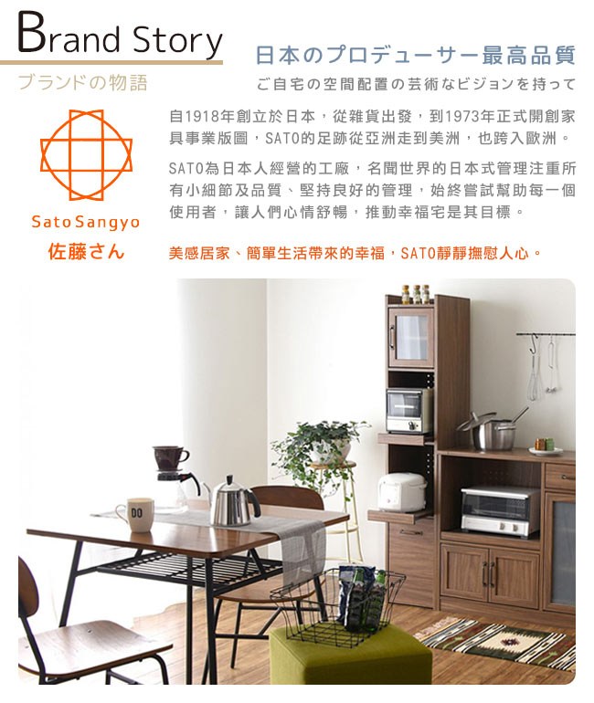 自1918年創立於日本,從雜貨出發,到1973年正式開創家具事業版圖。【Sato】的足跡從亞洲走到美洲,自然也跨入歐洲。【Sato】為日本人經營的工廠,名聞世界的日本式管理,幾十年來磨家具一劍,注重所有細節與品質,堅持良好的管理。始終嘗試幫助每一個使用者,讓人們心情舒暢,推動幸福宅是其目標。美感居家、簡單生活帶來的小確幸,【Sato】靜靜撫慰煩躁的人心。