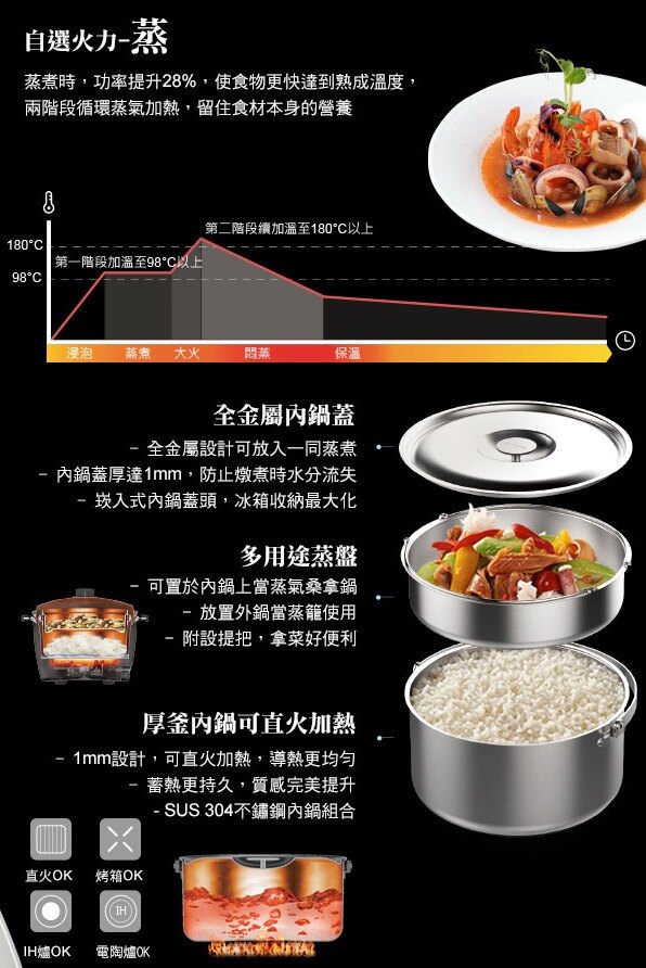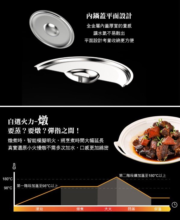 (1) 首創兩段式溫控,旺火快煮,微火細燉。