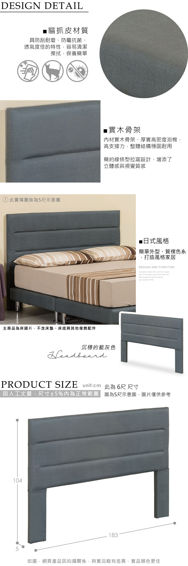 Homelike 喜家居雙人5尺貓抓皮床頭片(藍灰色)(1951)