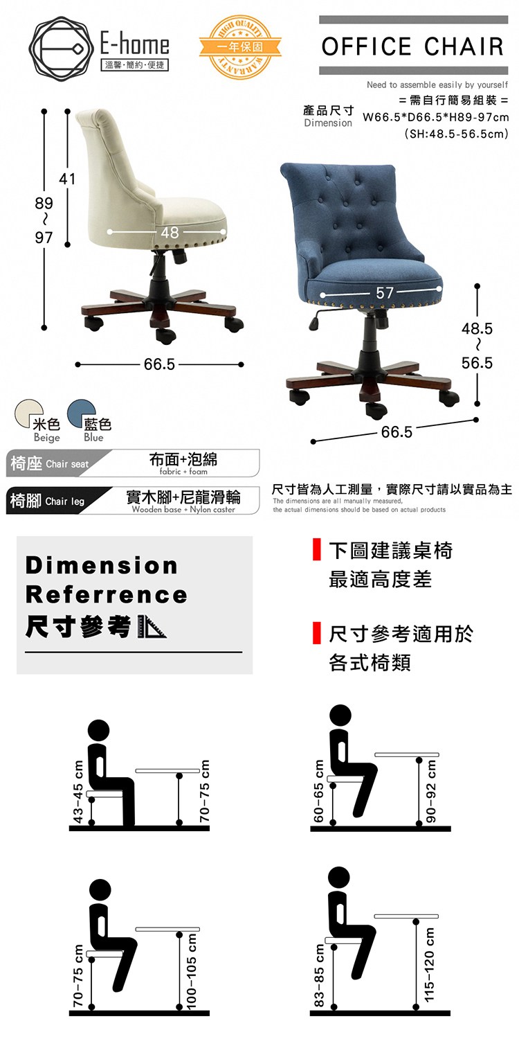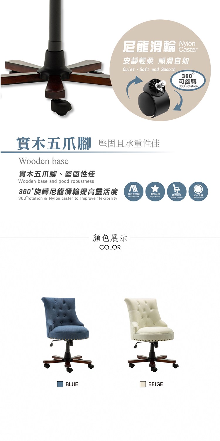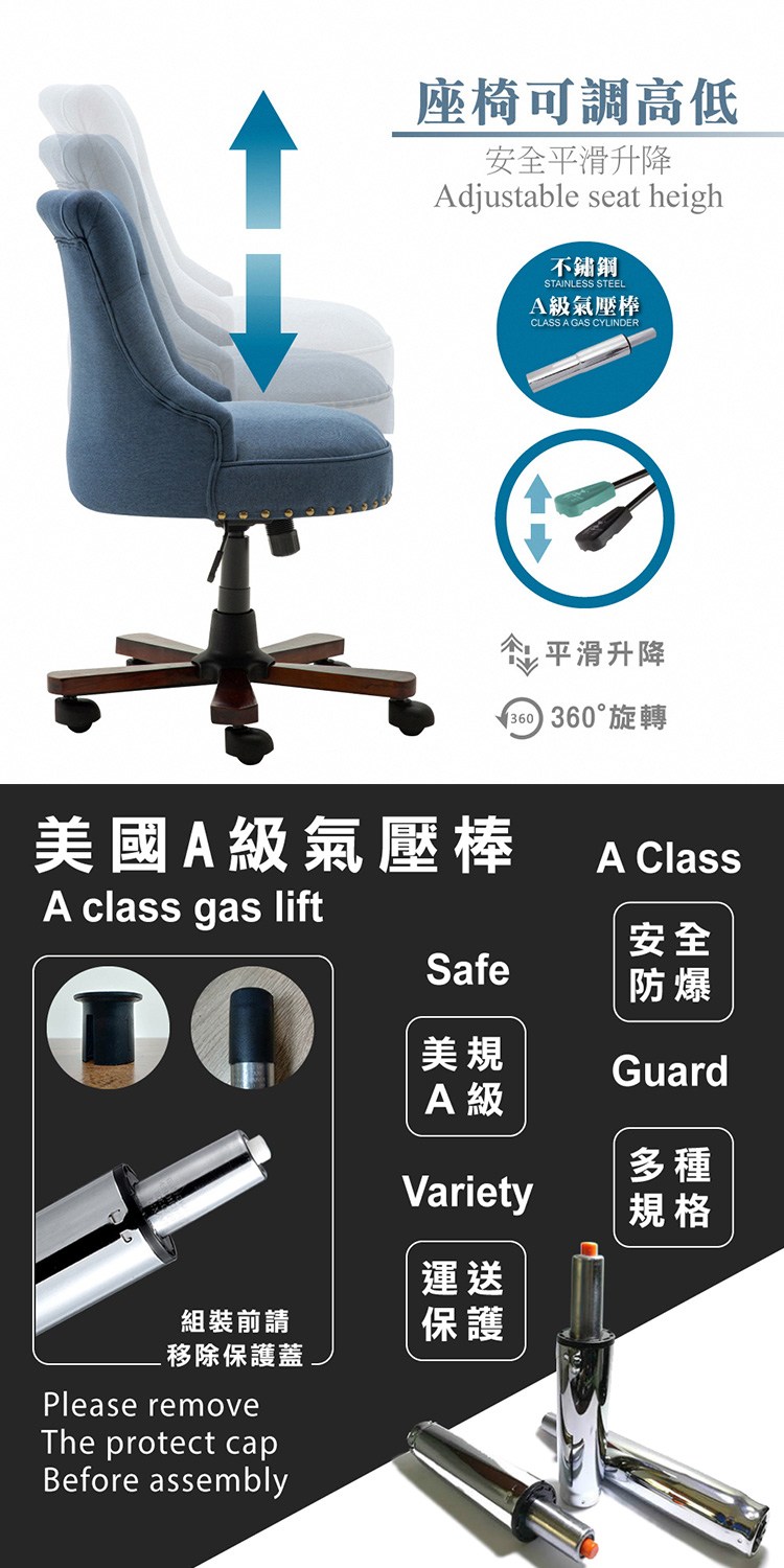 配備美規A級氣壓棒、安全升降,採典雅的實木五爪腳,堅固性佳,360°旋轉尼龍輪,使用靈活機動,