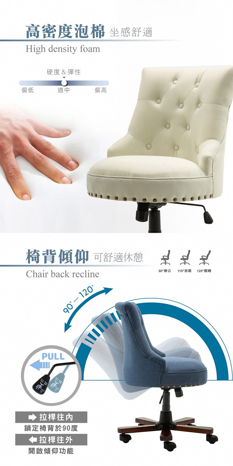 復古風格鉚釘邊飾,優雅又精緻,高密度泡棉椅背及椅座坐感舒適,外拉開啟椅背傾仰,可舒適休憩,
