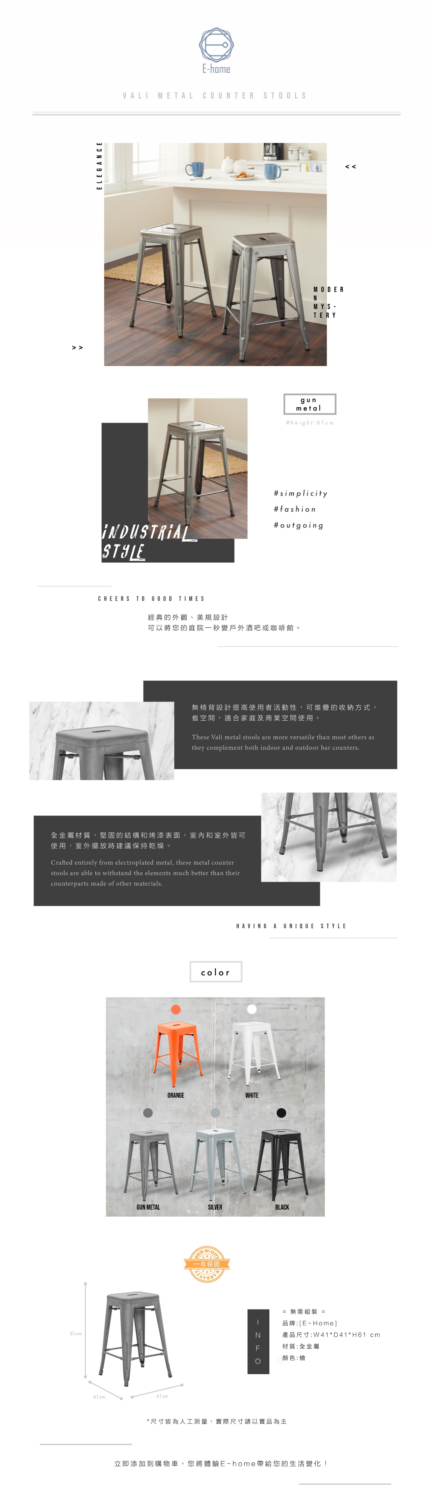 E-home Vali瓦力工業風可堆疊金屬吧檯椅-高61cm 槍色