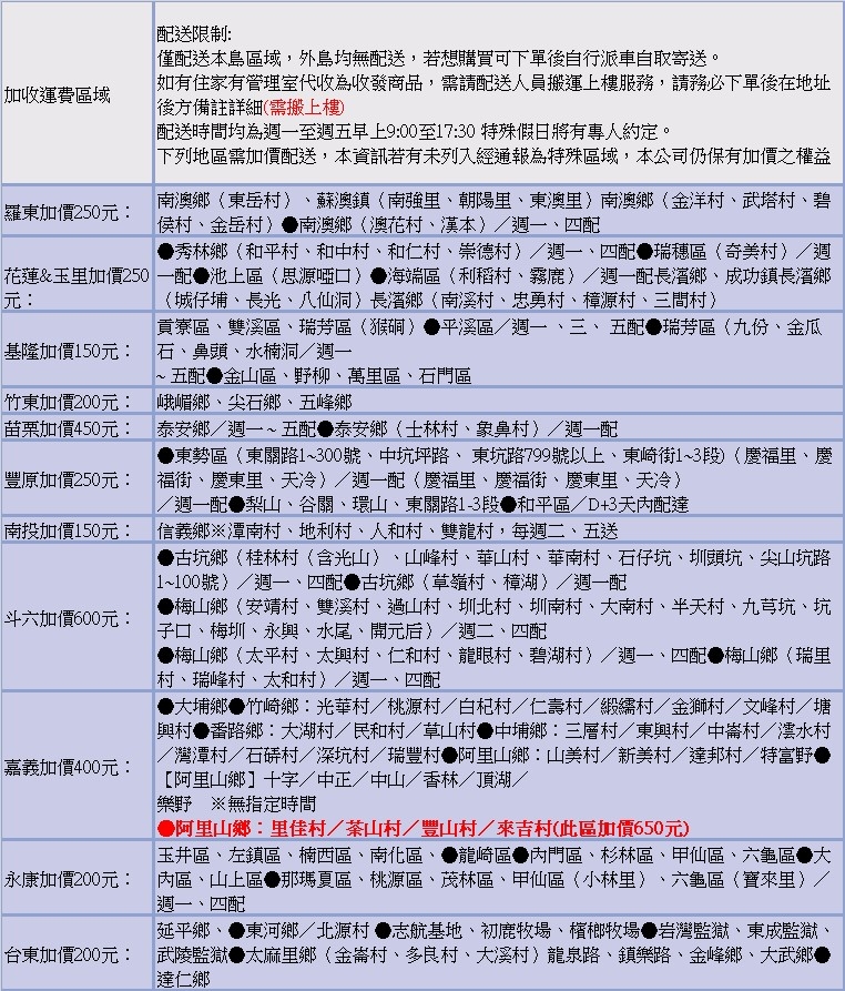 下列地區需加價配送,本資訊若有未列入經通報為特殊區域,本公司仍保有加價之權益