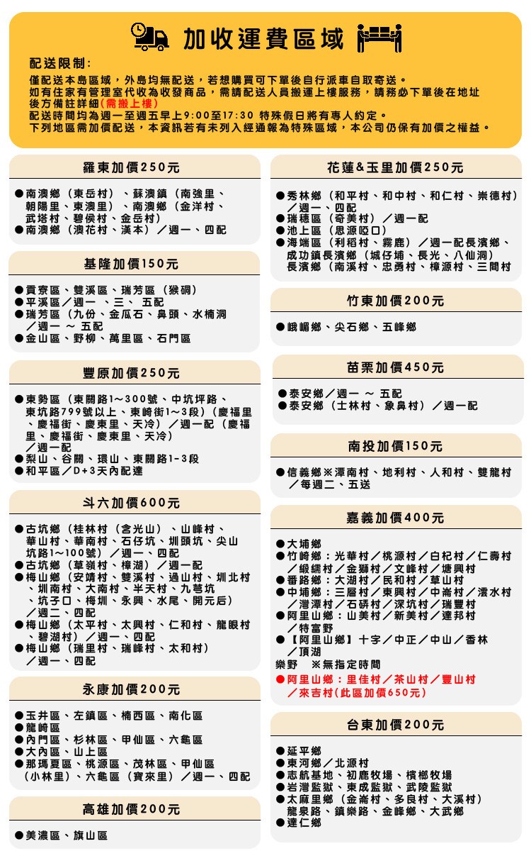 下列地區需加價配送,本資訊若有未列入經通報為特殊區域,本公司仍保有加價之權益