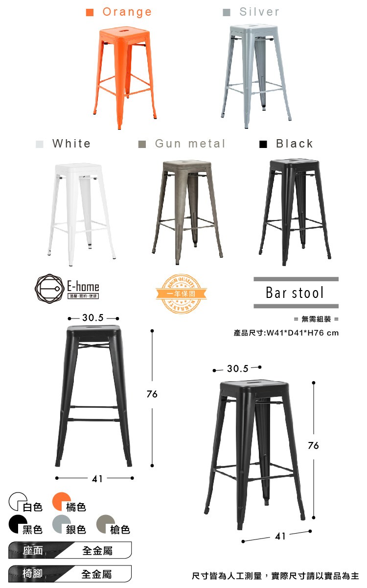 E-home亞尼工業風可堆疊金屬吧檯椅高76cm槍