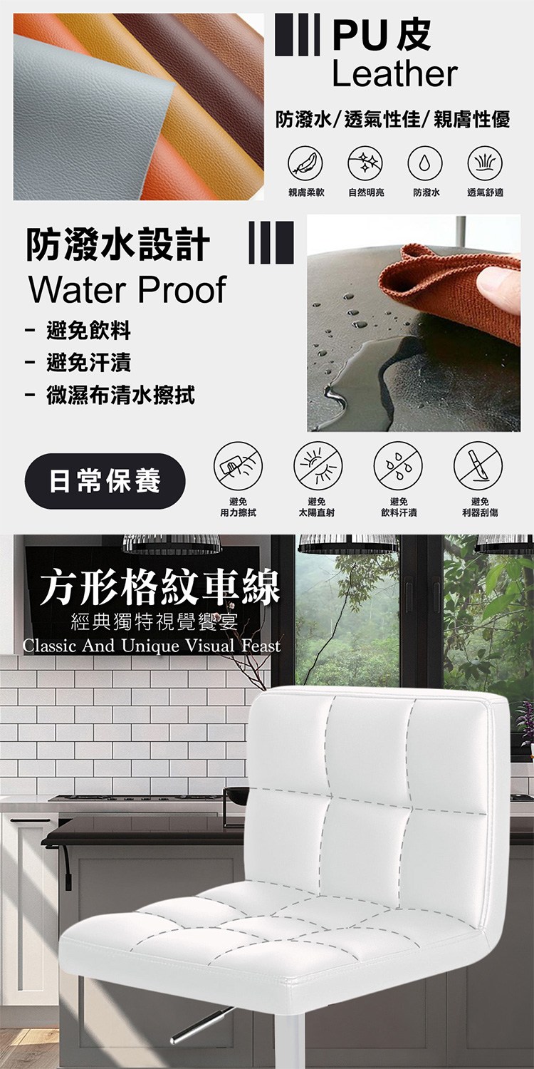 台灣與歐美同步販售、美規設計,經典方形格紋車線獨特視覺饗宴,防潑水之PU皮面椅座、易於清潔。