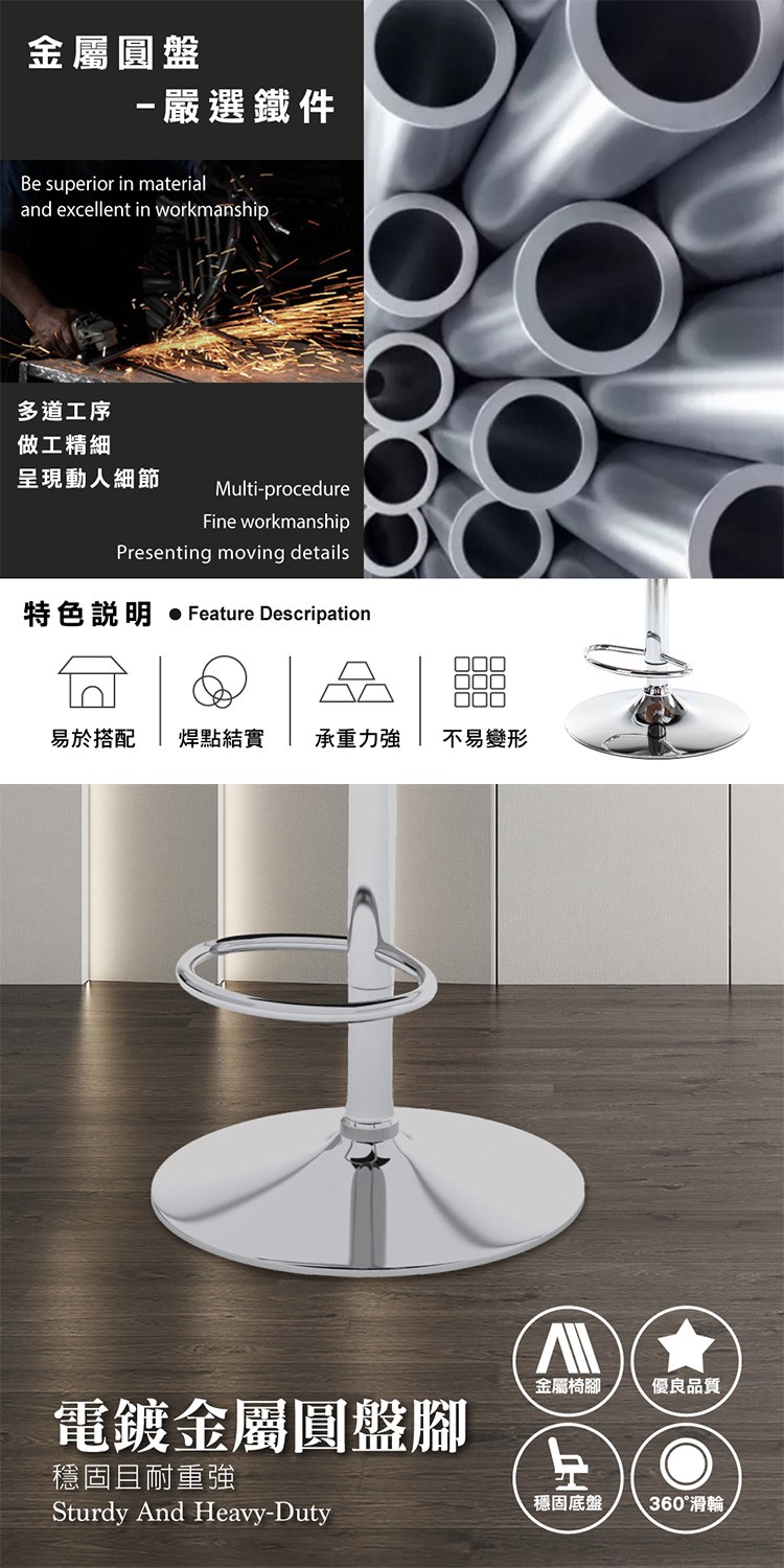 電鍍金屬圓盤腳、穩固且耐重強,易於搭配的顏色為空間注入創意,可配合吧檯或中島,享受完全的機動性。