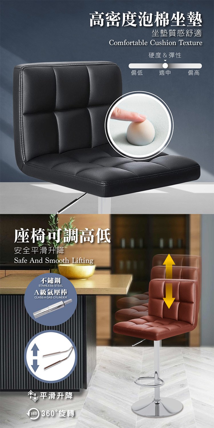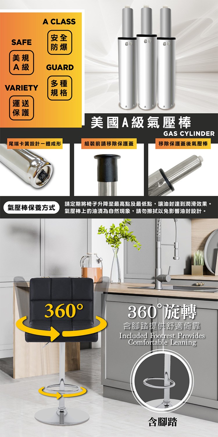 搭配高密度泡棉座墊,坐感舒適,配備美規A級氣壓棒、安全升降,360°旋轉含有腳踏提供休憩支撐,