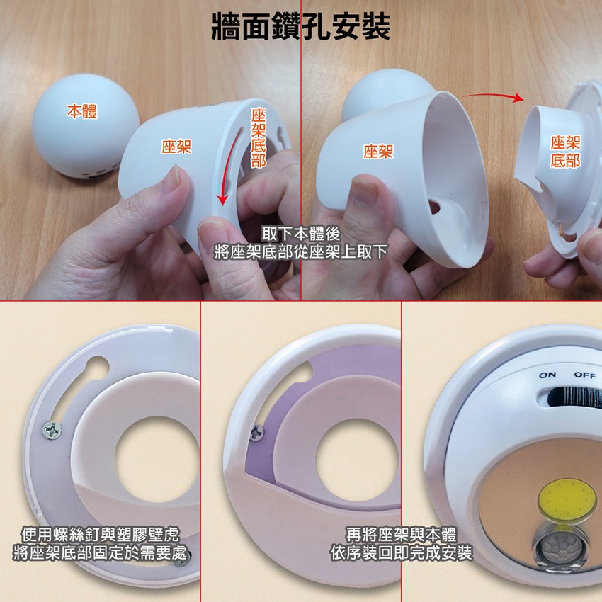 - 附有座架以及螺絲釘+塞孔帽與雙面膠泡棉可放於地上、置於桌面或安裝於壁面和天花板上自由運用。