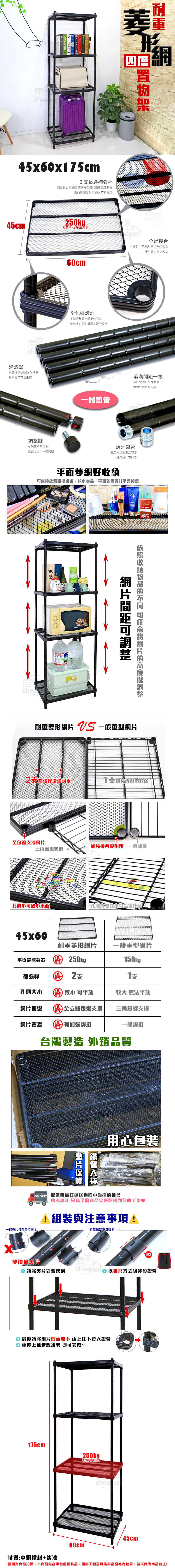 【品樂生活】45X60X213CM 耐重菱形網四層推車 烤漆霧黑/置物架/波浪架/收納架/鐵力士架/鐵架