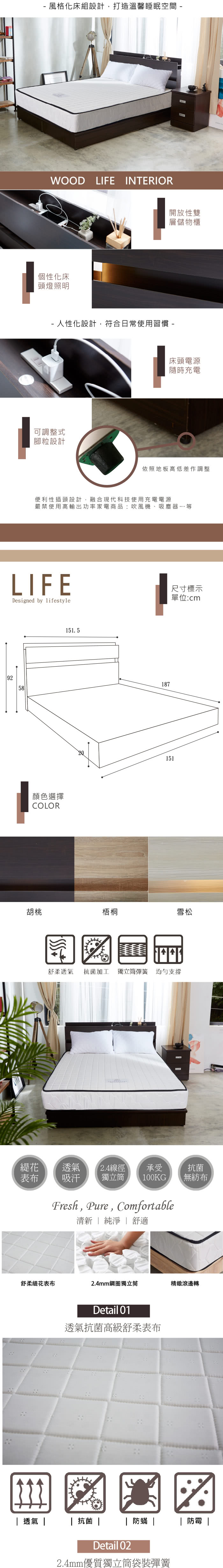 【藤原傢俬】青少年/銀髮族雙人5尺三件式房間組(6分半封床底+2層收納床頭+床墊)雪松雙人