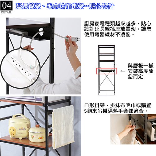 此外,有ㄇ形掛架能吊掛抹布毛巾或隔熱手套,在層板下方也設計了一個延長線插座放置架,在廚房家電種類越來越多的今日,貼心設計讓您使用電器線材不凌亂。