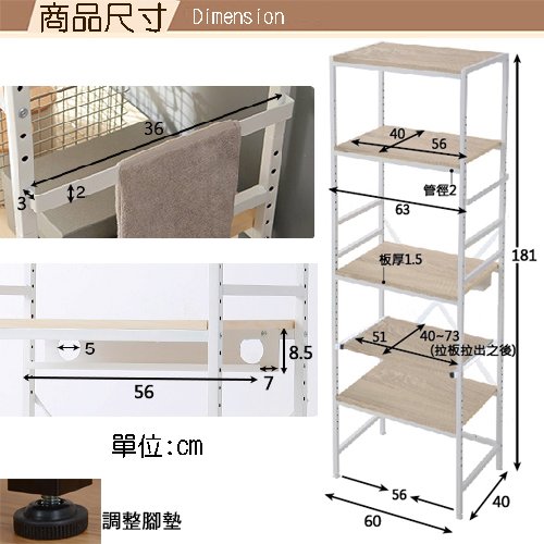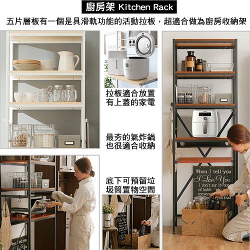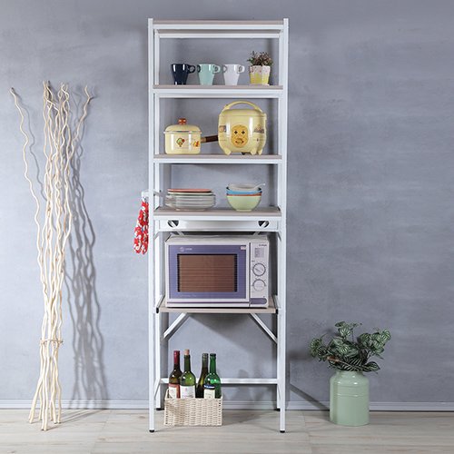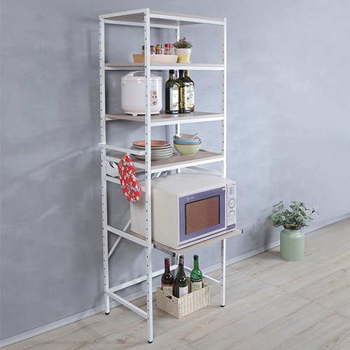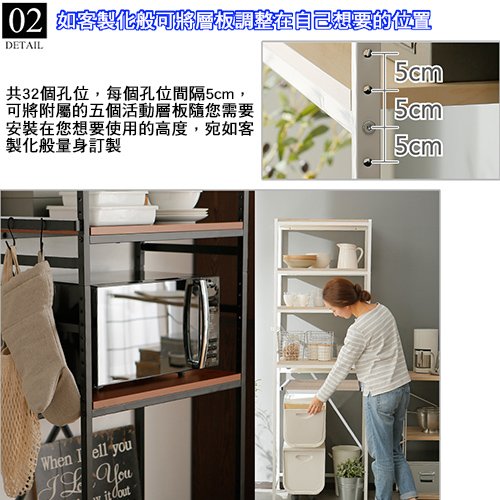 層板尺寸56x40cm適用於所有的廚房家電,因為層板可以調整在任何的高度,廚房的各種家電無論現在正夯的氣炸鍋還是烤箱與微波爐都可收納,有上蓋的炊飯鍋或熱水瓶更可放置於活動拉板上,除了活動板還有多達4片的移動層板,廚房所有物品都能完整收納,絕對是最稱職的廚房置物架,擺放於洗衣室或衛浴空間內也非常適當哦。