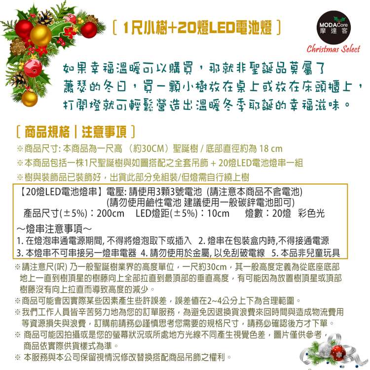 摩達客 1尺裝飾聖誕樹(木質雪花系)+LED20燈銅線燈(暖白光)(USB電池兩用充電)