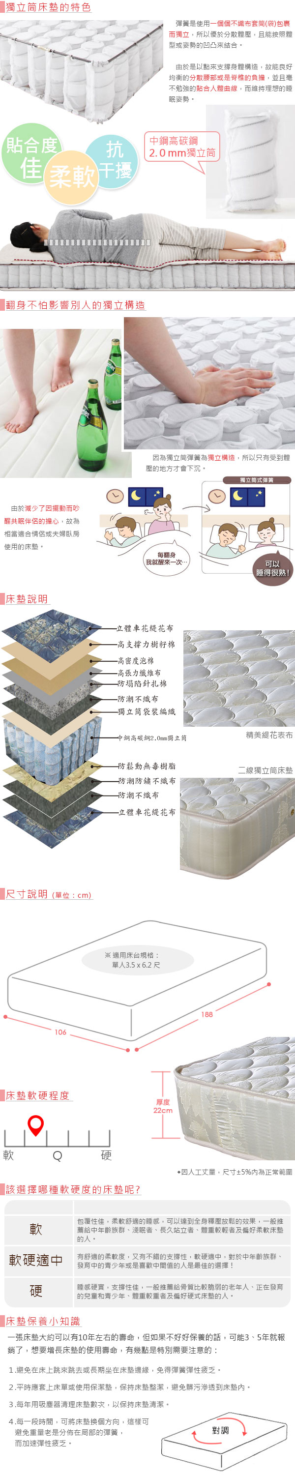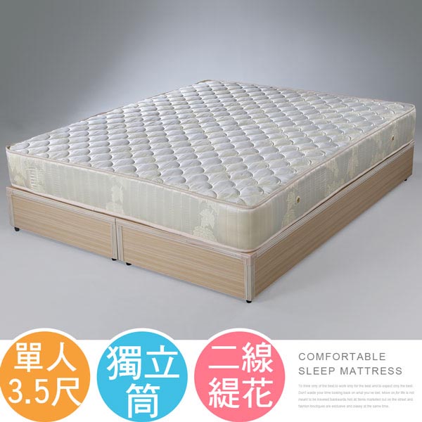 表布為精緻舒適的緹花布,做工精緻;材質使用中鋼2.0mm高碳鋼獨立筒,耐用度佳,獨立筒設計,抗干擾,起身、翻身也不怕影響身邊人,對於偏好睡舒適柔軟床墊的人,獨立筒床墊是您的最佳選擇!