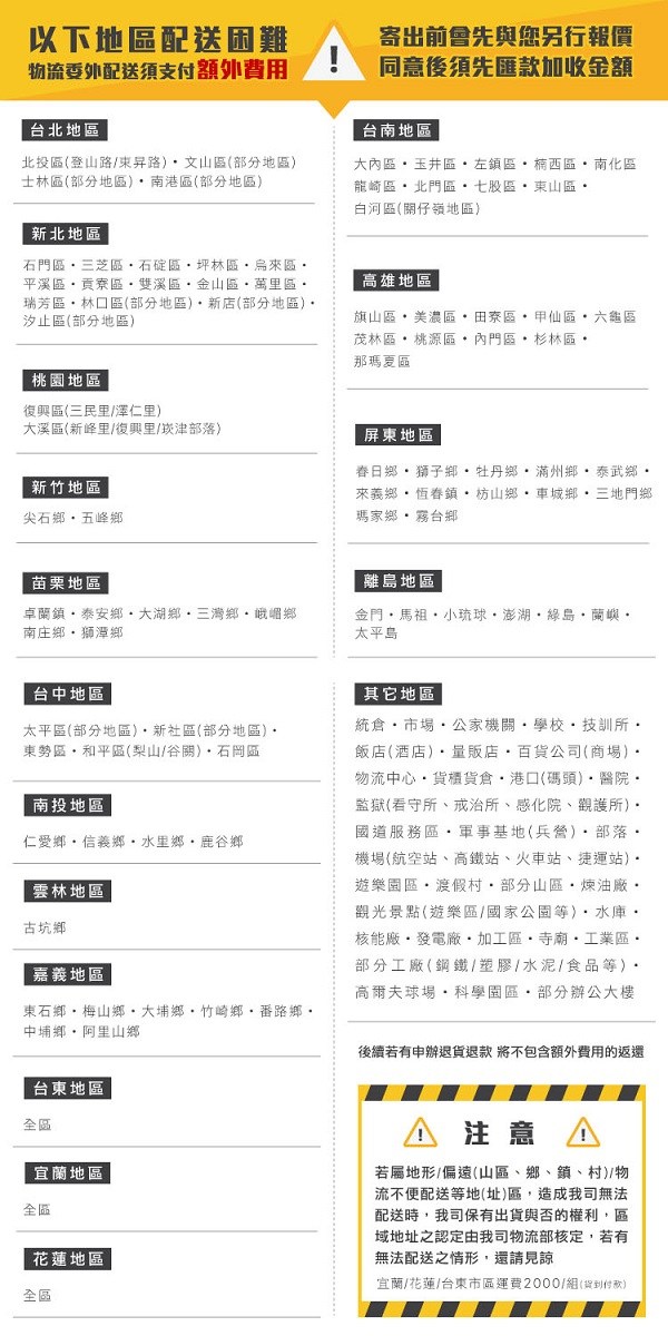 | 注意事項 | 衣架為全新品會有些許黏度(浸塑關係)&氣味 建議可以掛置通風處後再使用 上述配送困難地區,物流委外配送須支付[額外費用] 寄出前會先與您報價,報價同意後,須先匯款加收金額 後續若有申辦退換貨退款時,將不包含[額外費用]的返還 因大量生產,難免烤漆面不勻表面磨痕等小細節 不影響本體使用功能,介意者請斟酌 DIY組裝商品請戴上工作手套,避免不必要的傷害 DIY商品組裝前請先核對說明書/施工方式 如商品配件有問題請勿組裝,並立即反應訂購平台客服處理 收到商品七天內有問題請洽客服協助處理 鑑賞期非試用期,尚未考慮是否需要退換貨時,請勿拆封使用 退貨商品需返還原狀,若無法原狀返還會酌收整新費 顏色可能因螢幕造成色差、以上規格資料若有任何誤差,以實際商品為準 商品僅配送至收貨地址一樓,無協助搬運上樓 商品一旦寄出後,若需變更配送地址則會收取轉運費用 因地型/偏遠區域(山區、鄉、鎮、村)本公司無配送時 我司保有出貨與否權利,區域之認定由我司物流部核定 |