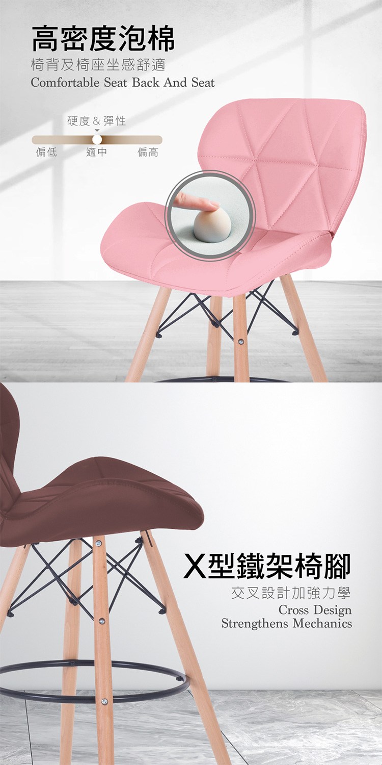 高密度泡棉椅背及椅座坐感舒適,椅腳採X型鐵架交叉設計加強力學,櫸木實木腳,紋理細緻穩固耐用,