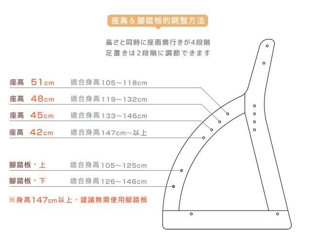 適合小童-大童成長,讓孩子從小用到大的實木學童椅。可隨年齡的身高,來調整 4 段座高、2 段腳踏高度。當小孩坐在椅上時,安全壓力輪感應到重量後,學童椅便會固定位置,不會移動、旋轉、亂晃,安定孩子的坐姿,讓父母安心無虞。