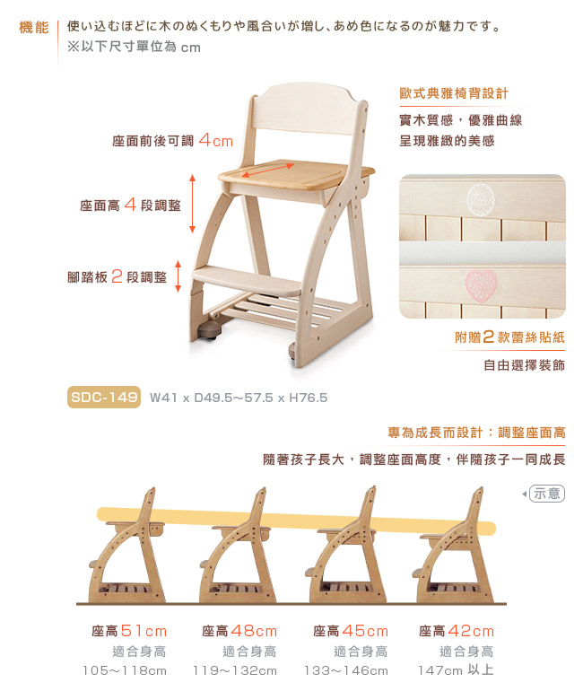 ◆ 座深可調4cm,座面微傾斜,防止學童彎腰駝背