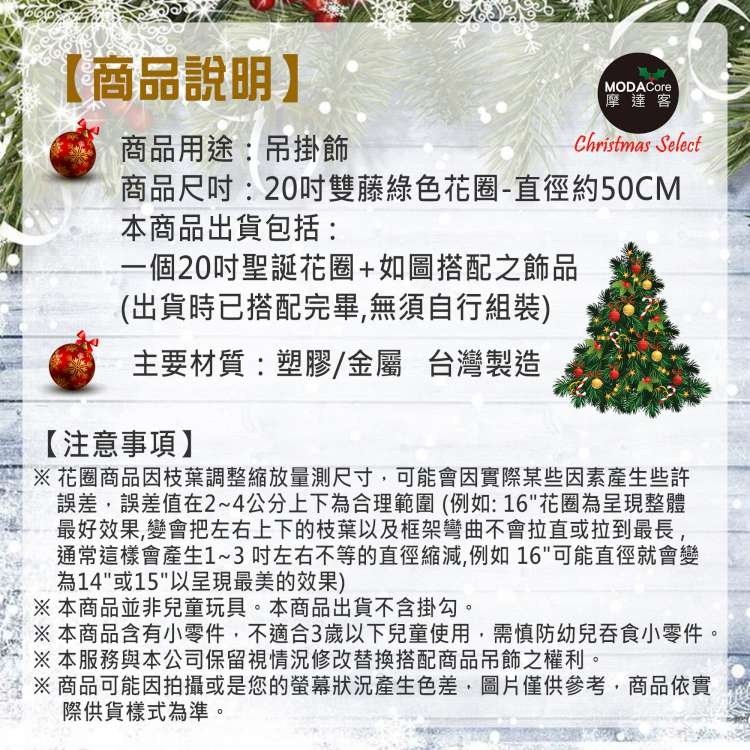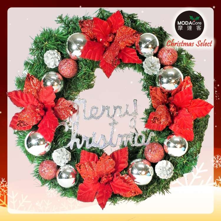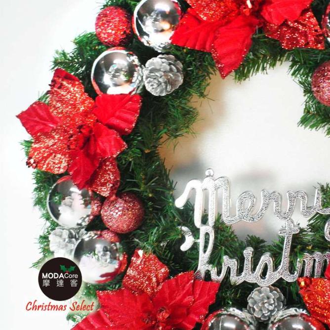 MODACore 摩達客 - 耶誕-20吋浪漫朵朵聖誕花豪華綠色聖誕花圈福臨圈(紅銀系)(台灣手工藝製/免組裝) 本...
