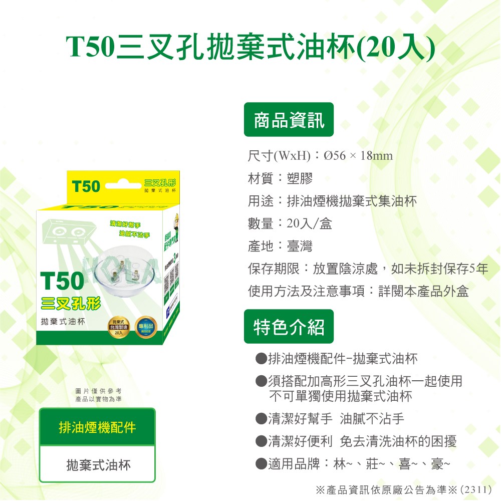 品名:T50加高形三叉孔形拋棄式油杯(20入)