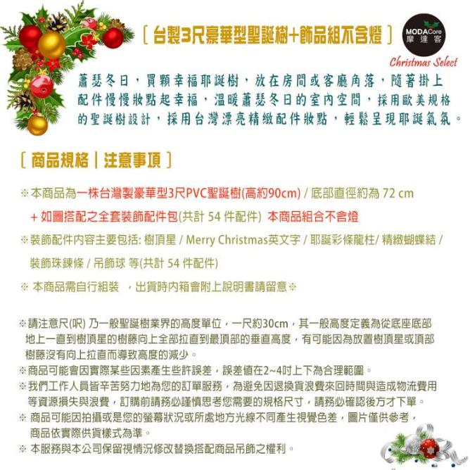 摩達客3尺豪華型裝飾綠色聖誕樹紅金色系配件不含燈