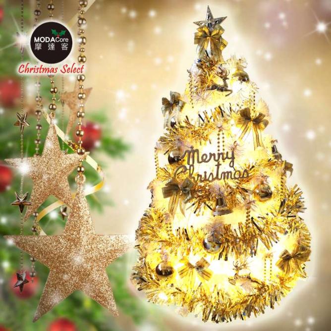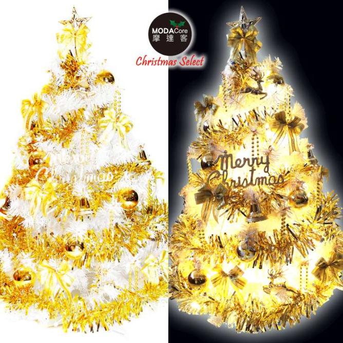 MODACore 摩達客 - 耶誕★台灣製3呎/3尺(90cm)豪華版夢幻白色聖誕樹(流金系配件組)+50燈LED燈插電式燈串...