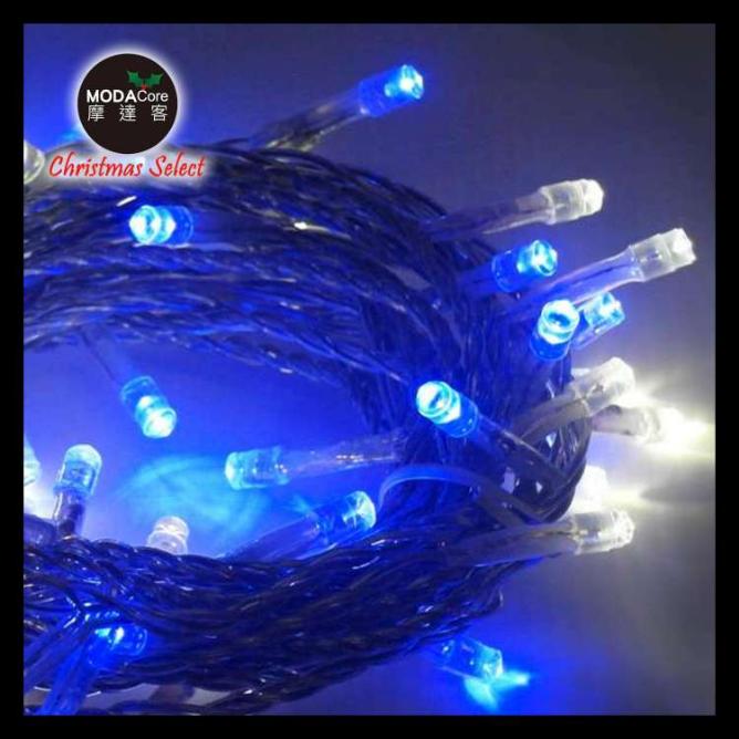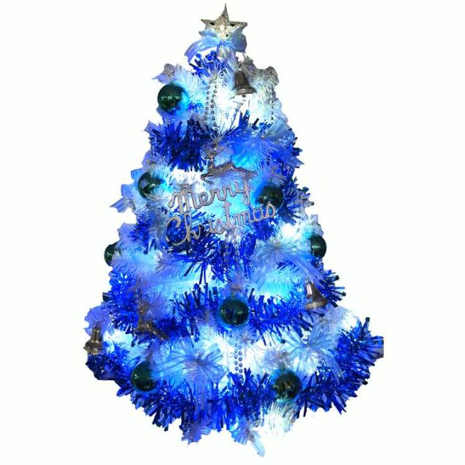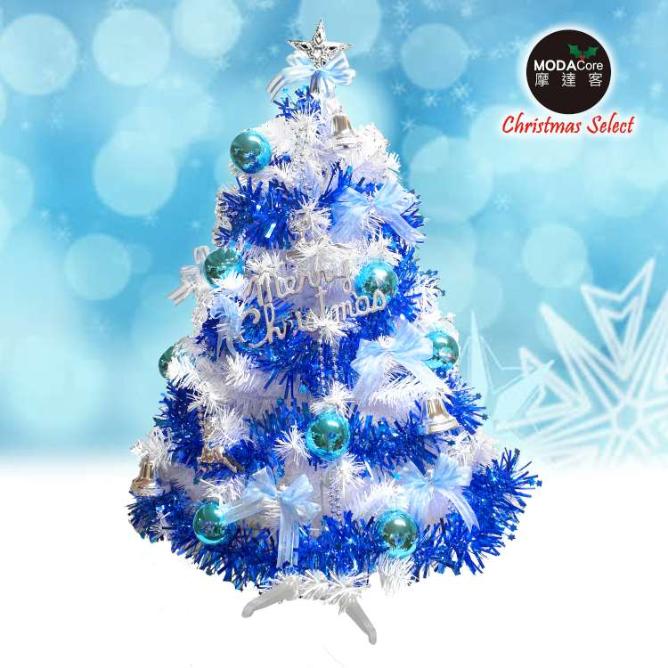 摩達客3尺豪華夢幻白色聖誕樹銀藍系配件組50LED燈插電燈串一串藍白光