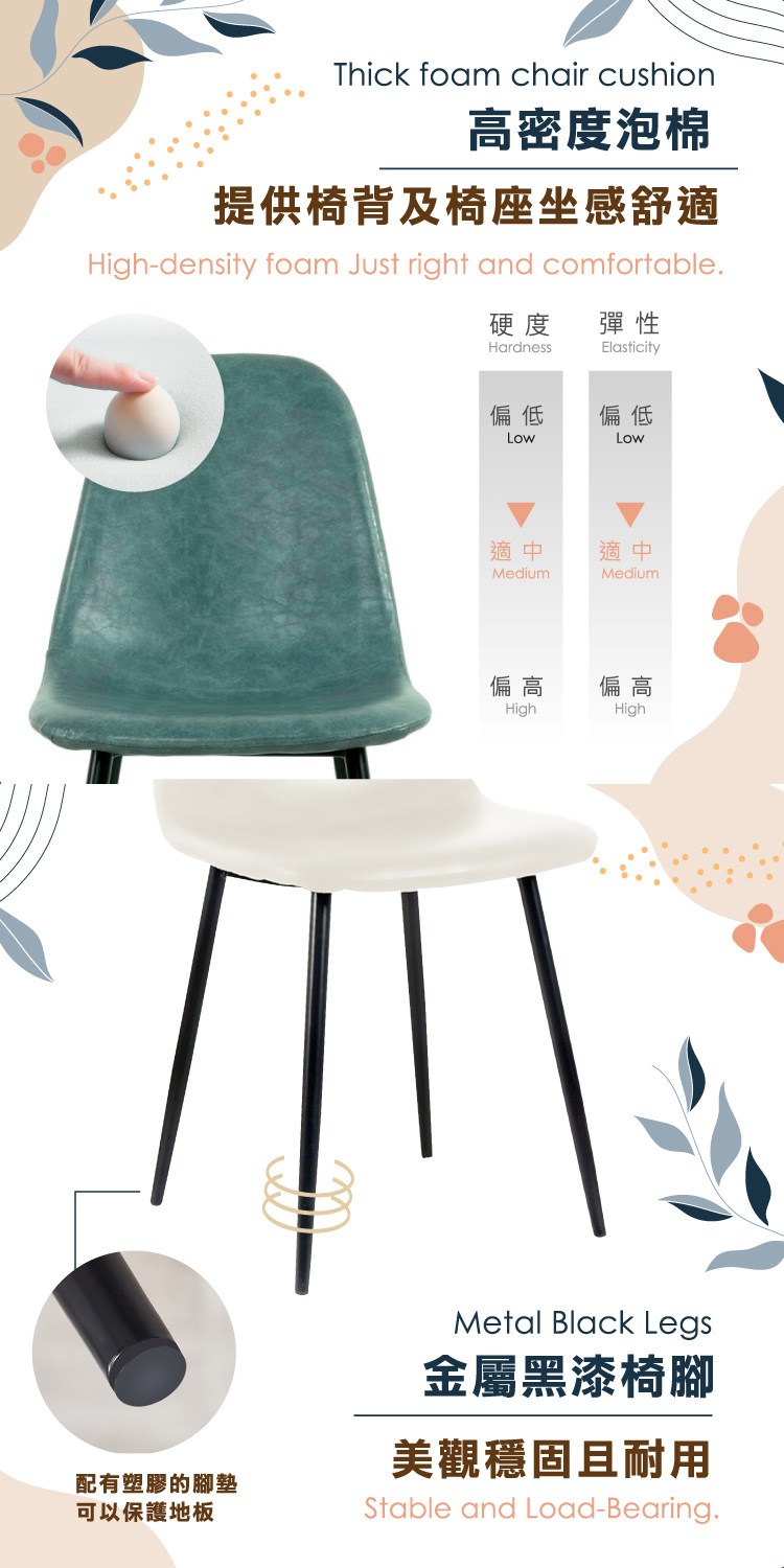 高密度泡棉椅背及椅座坐感舒適,金屬黑漆椅腳,美觀穩固且耐用,配有塑膠的腳墊、可以保護地板,