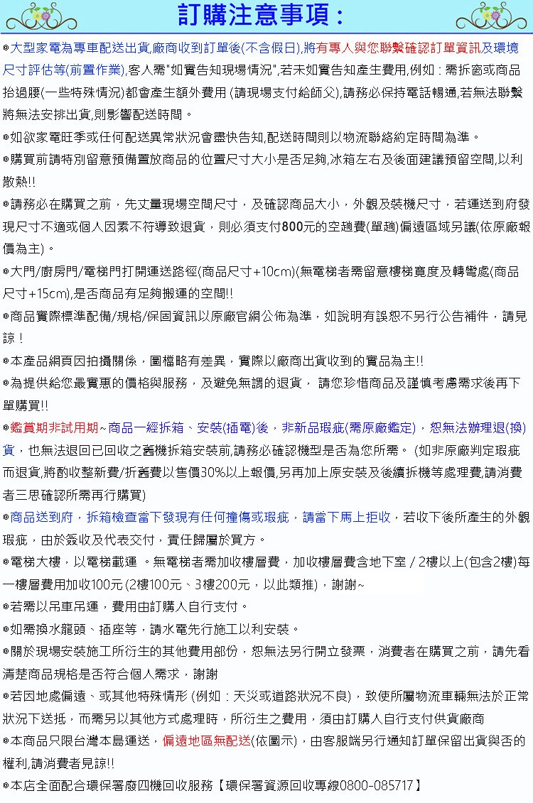◎大型家電為專車配送出貨,廠商收到訂單後(不含假日),將有專人與您聯繫確認訂單資訊及環境尺寸評估等(前置作業),客人需如實告知現場情況,若未如實告知產生費用,例如 : 需拆窗或商品抬過腰(一些特殊情況)都會產生額外費用 (請現場支付給師父),請務必保持電話暢通,若無法聯繫將無法安排出貨,則影響配送時間